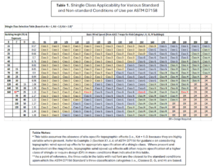 Because the ASTM D7158 Standard’s method of classifying shingles is based on wind engineering principles of ASCE 7, shingle classification results can be mathematically scaled to match the actual wind loads experienced in diverse, real-world building scenarios and wind conditions. Such scaling has been done in Table 1, which provides guidance for conditions that differ from the standard conditions used by ASTM D7158. Use of Table 1 does not require any additional analysis or re-evaluation of shingles since the shingles are consistent with the ASTM D7158 methodology. As a point of reference, the three cells in the table with red font are the closest to the standard conditions upon which the ASTM D7158 Standard’s three classification categories (i.e., Classes D, G, and H) are based.